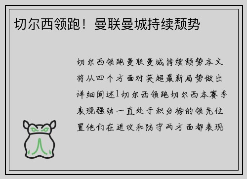 切尔西领跑!曼联曼城持续颓势,本文将从四个方面对英超最新局势做出详细阐述。 1、切尔西领跑 切尔西本赛季表现强劲,一直处于积分榜的领先位置。他们在进攻和防守两方面都表现出色,展现出了冠军球队的实力。...